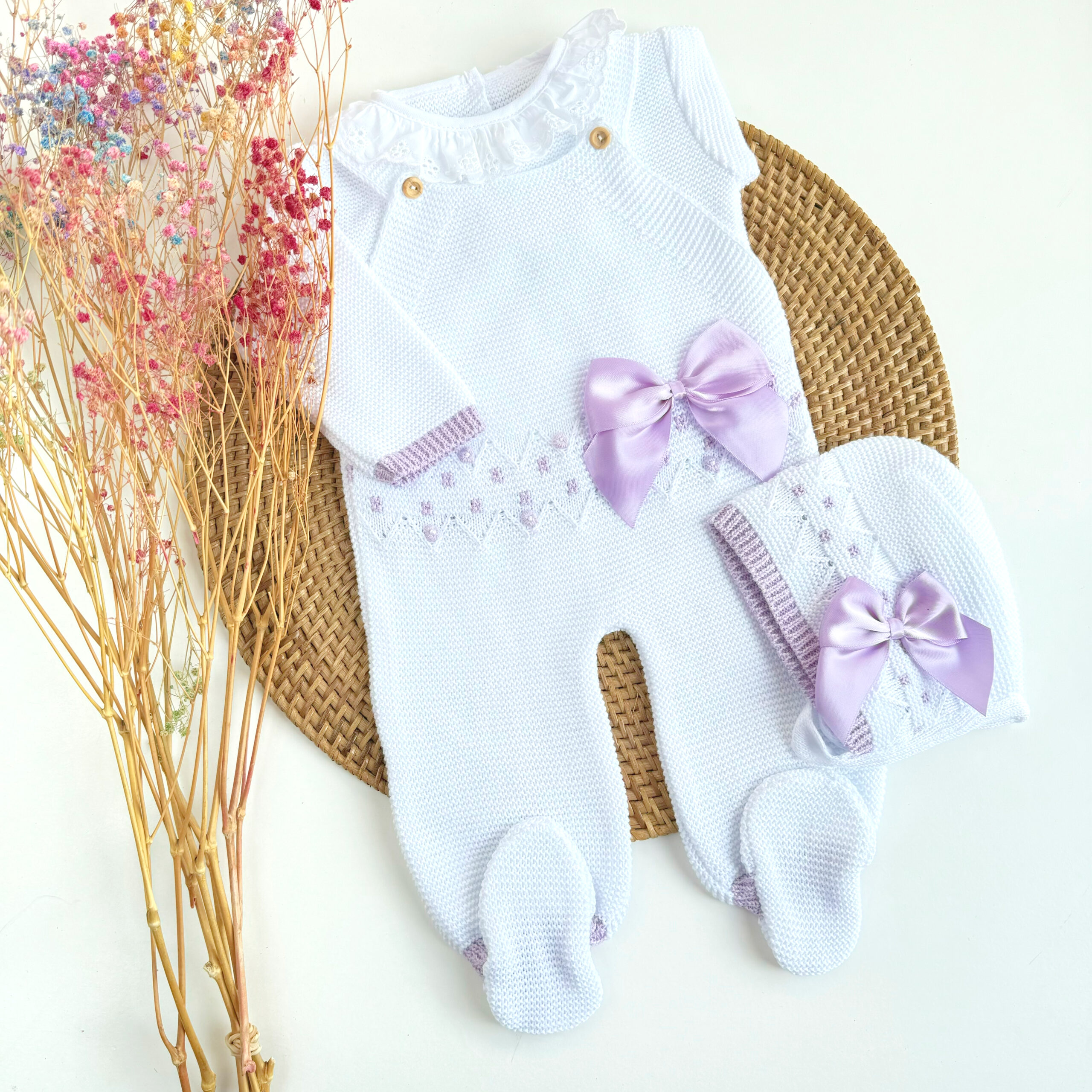 Primera puesta para vestir a la bebé en sus primeras semanas de vida. Peto en talla única 0-3 meses, con jersey y capota a juego.