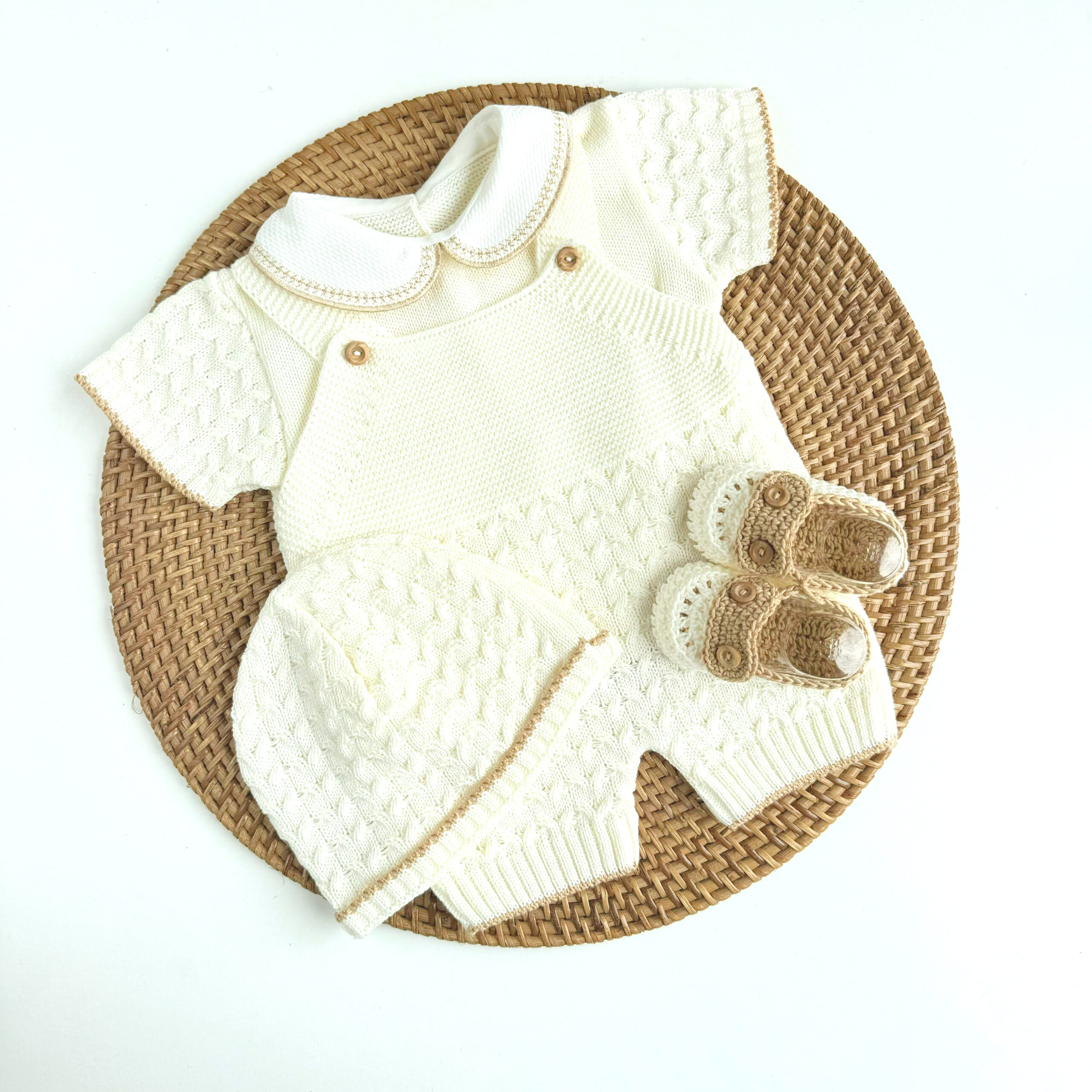 Primera puesta para vestir al bebé en sus primeras semanas de vida. Peto en talla única 0-3 meses, con jersey y gorrito a juego.