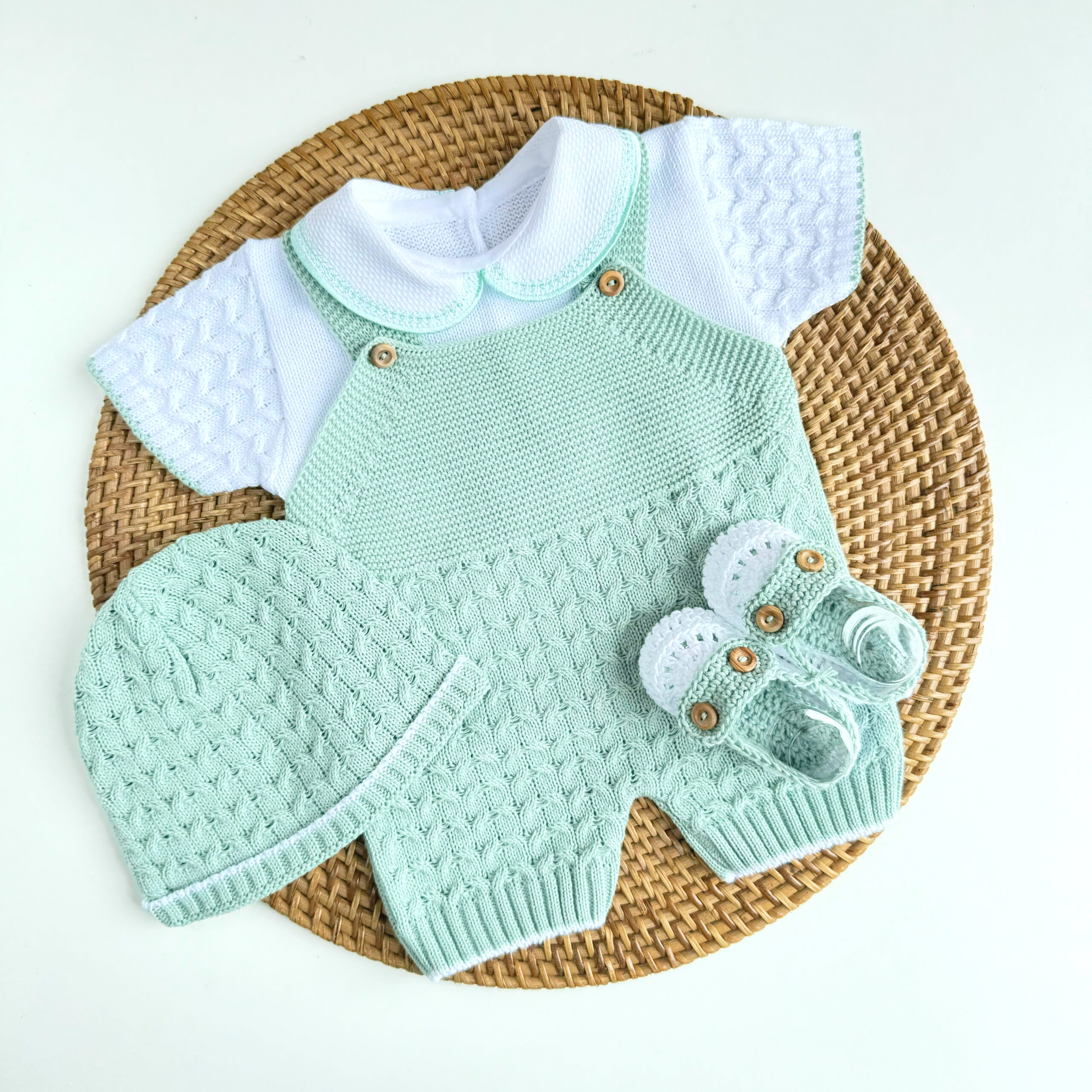 Primera puesta para vestir al bebé en sus primeras semanas de vida. Peto en talla única 0-3 meses, con jersey y gorrito a juego.