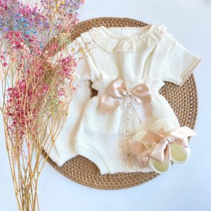 Precioso pack de culotte con jersey, capota  y patucos a juego, todo en hilo perlé y con delicados encajes en cuello y en piernas. Ideal para primavera-verano.
