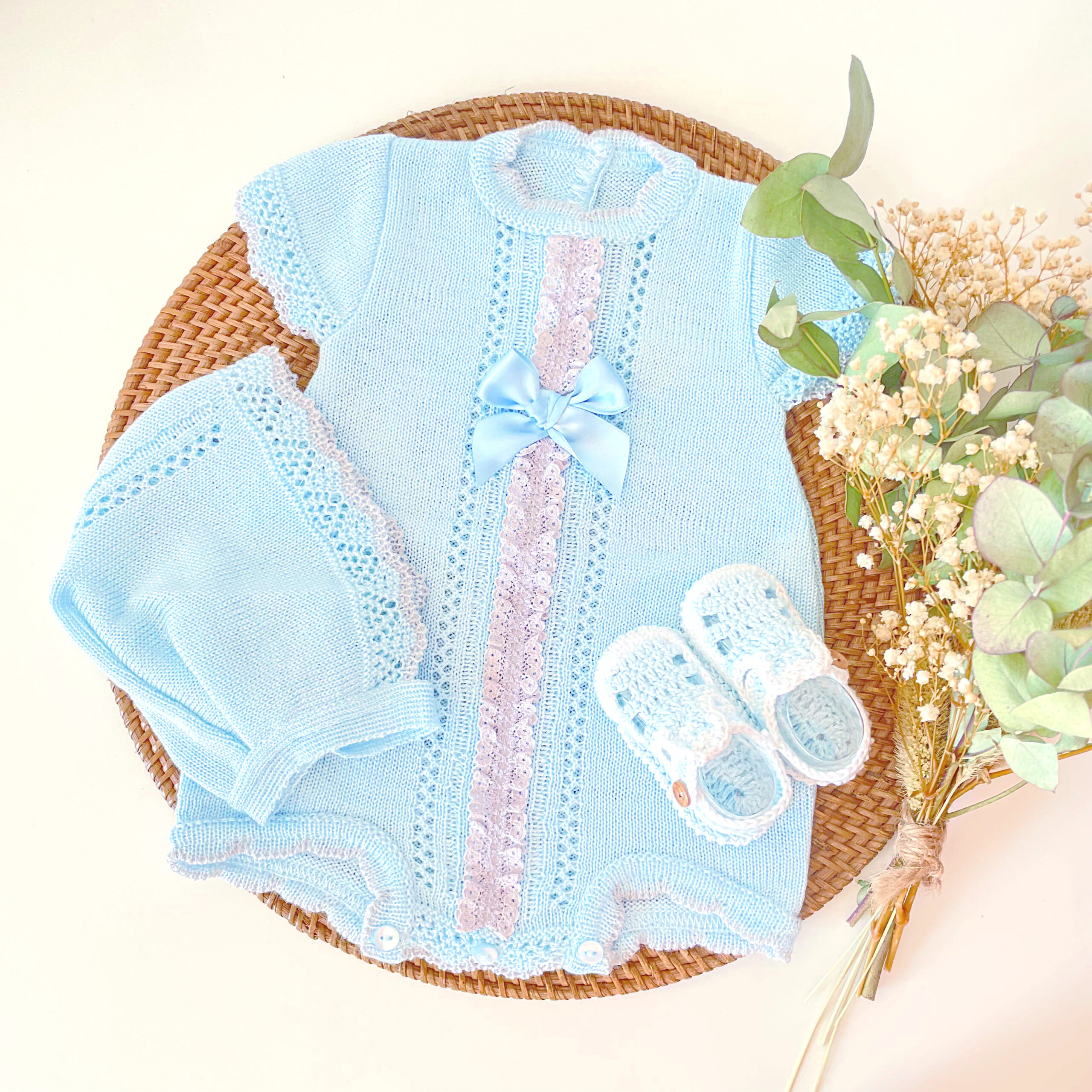 Precioso pelele de perlé con capota y zapatitos a juego ideal para los días de verano talla única 0-3 meses.