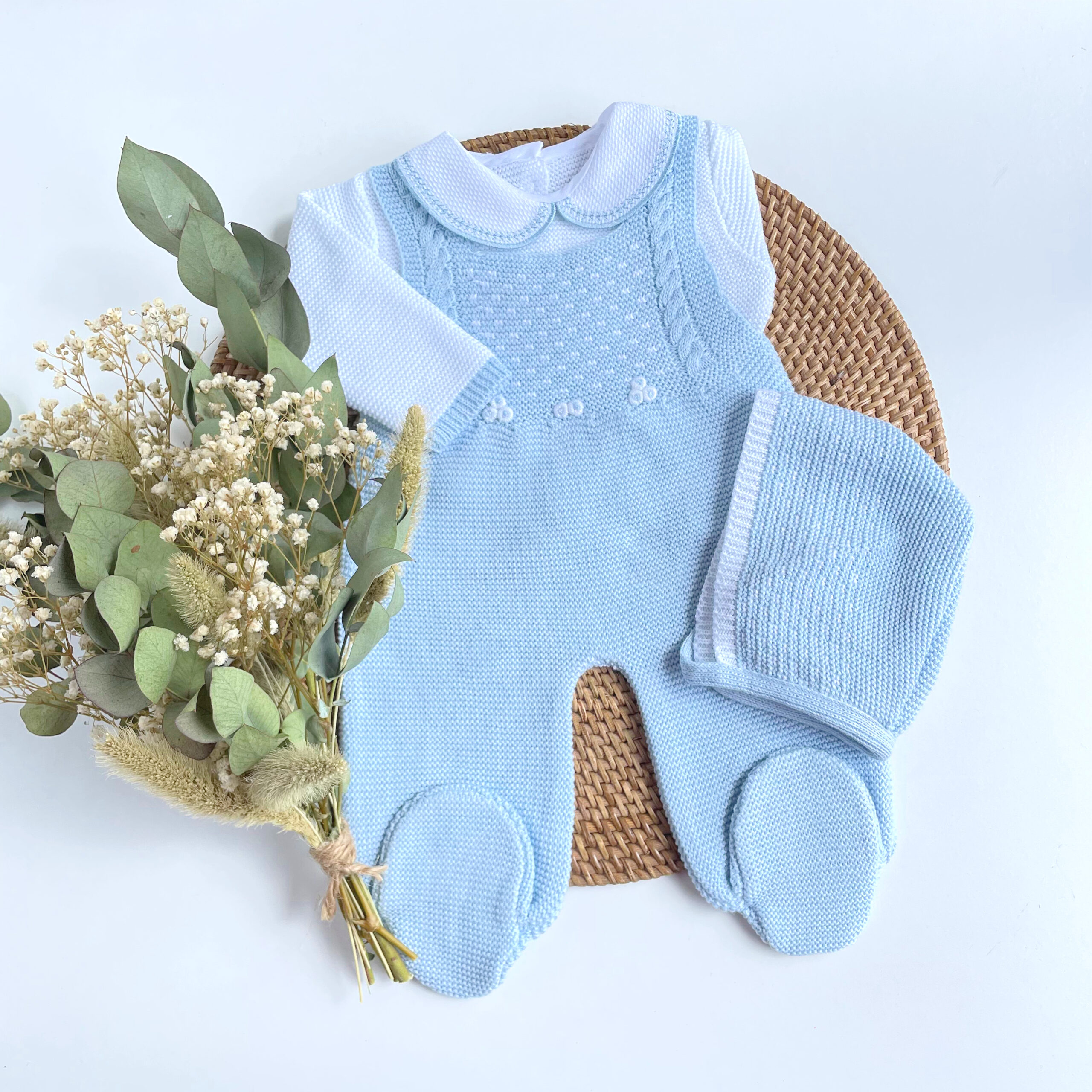 Primera puesta para vestir al bebé en sus primeras semanas de vida. Peto en talla única 0-3 meses, con jersey y capota a juego.