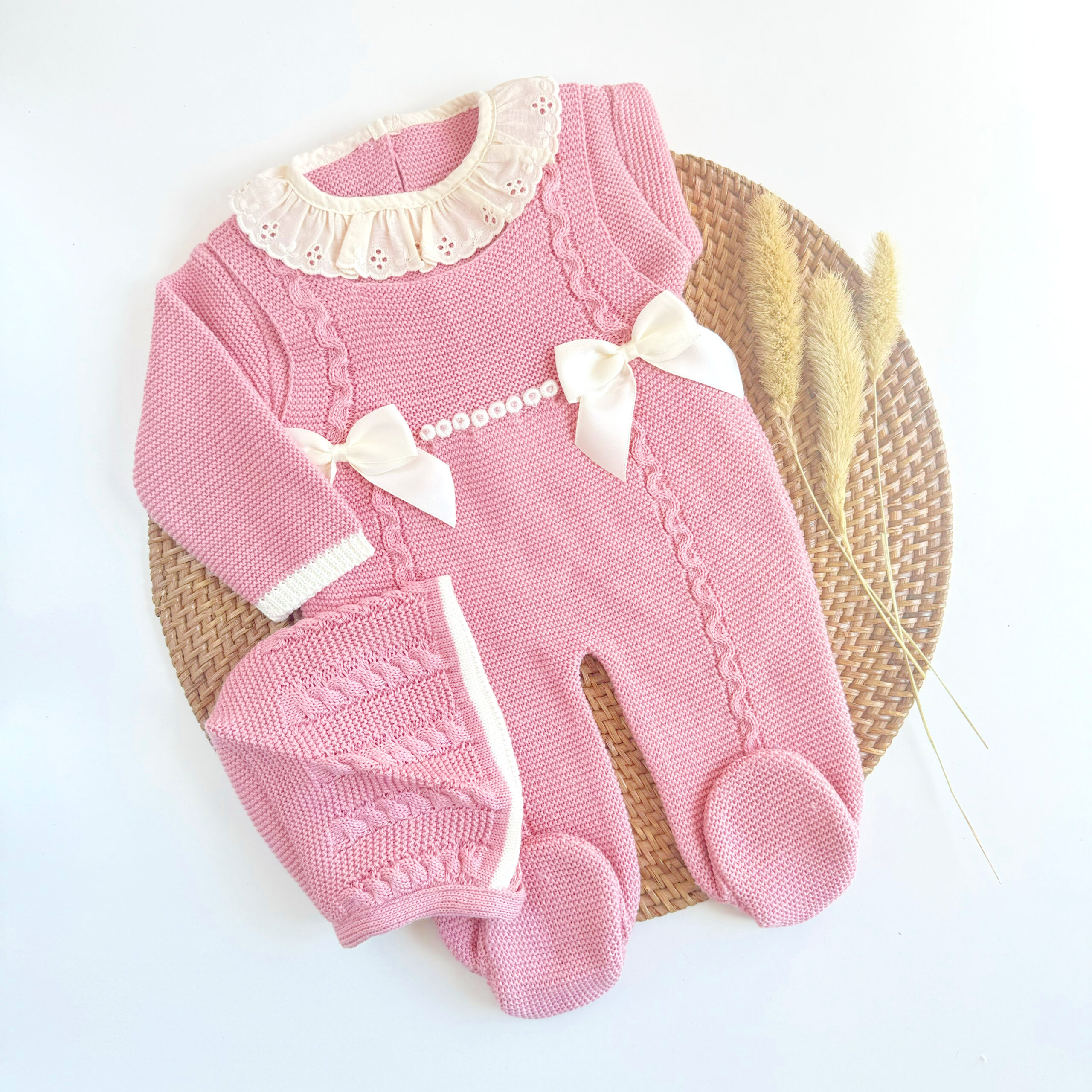 Primera puesta para vestir a la bebé en sus primeras semanas de vida. Peto en talla única 0-3 meses, con jersey y capota a juego.