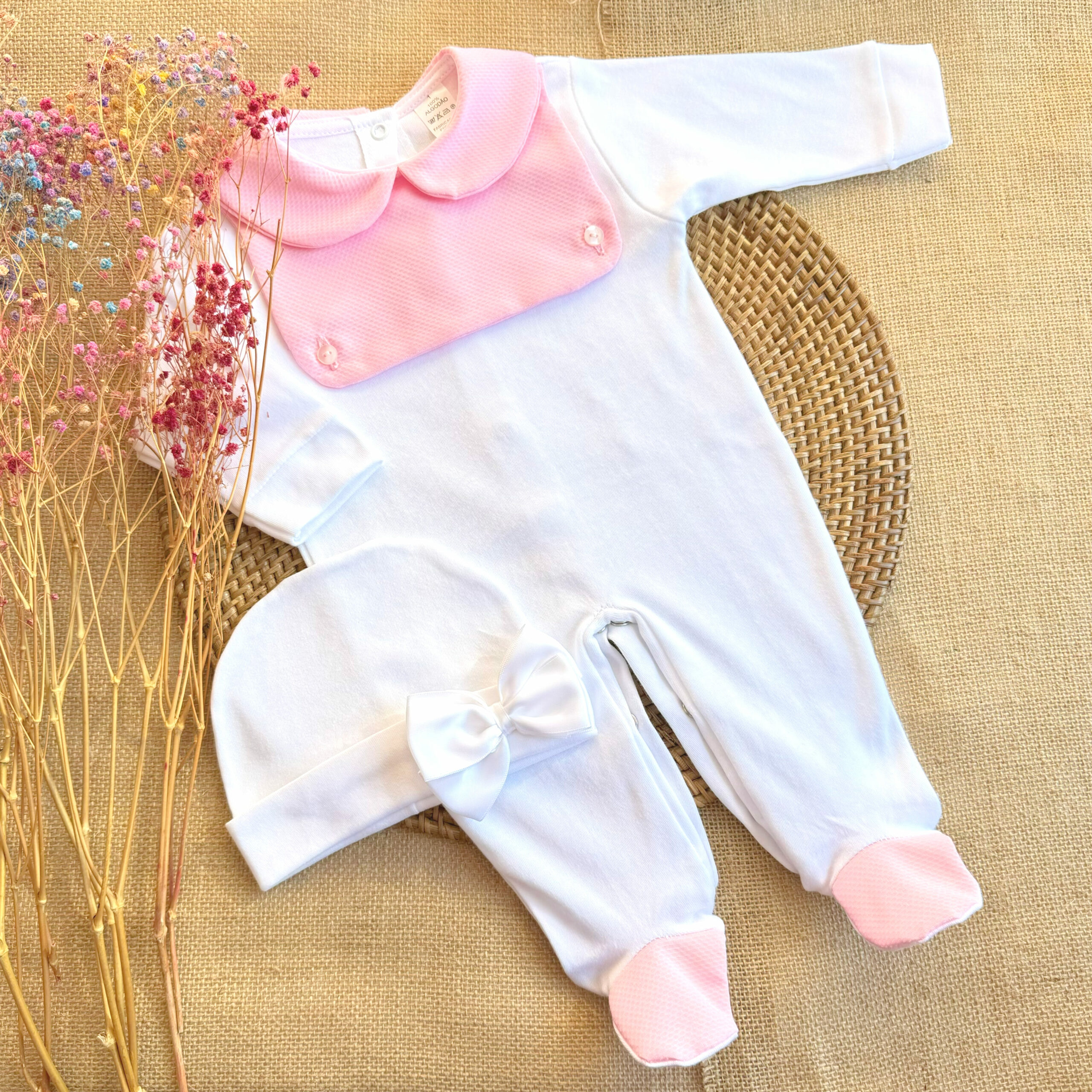 Pijama Babero Piqué Blanco Rosa con Lazo