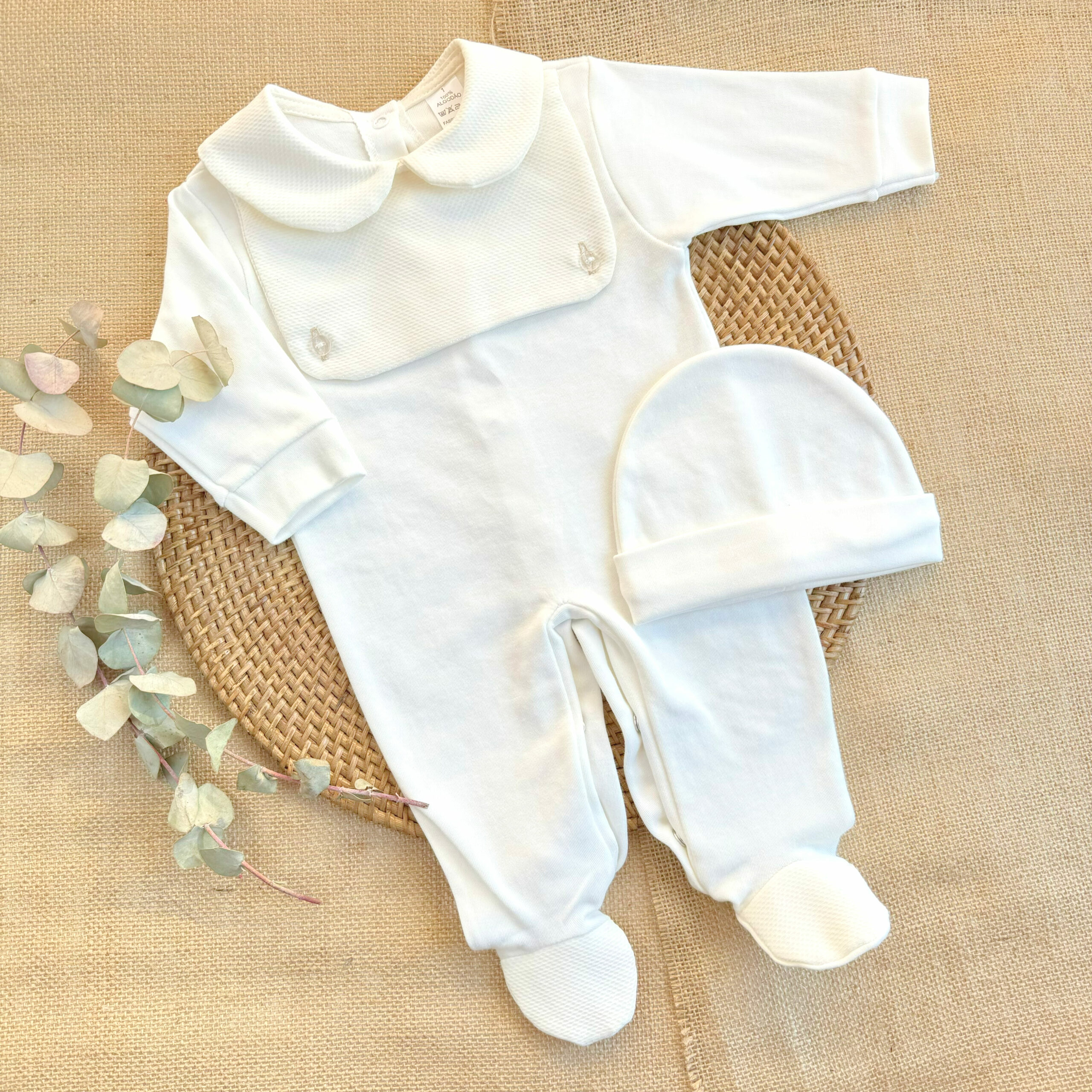 Precioso pijamita de algodón 100 % con gorrito a juego. Ideal para verano, para que los bebés estén cómodos y bellos en cualquier situación. Se abrocha por la espalda y por la entrepierna con corchetes para facilitar el cambio de pañal.