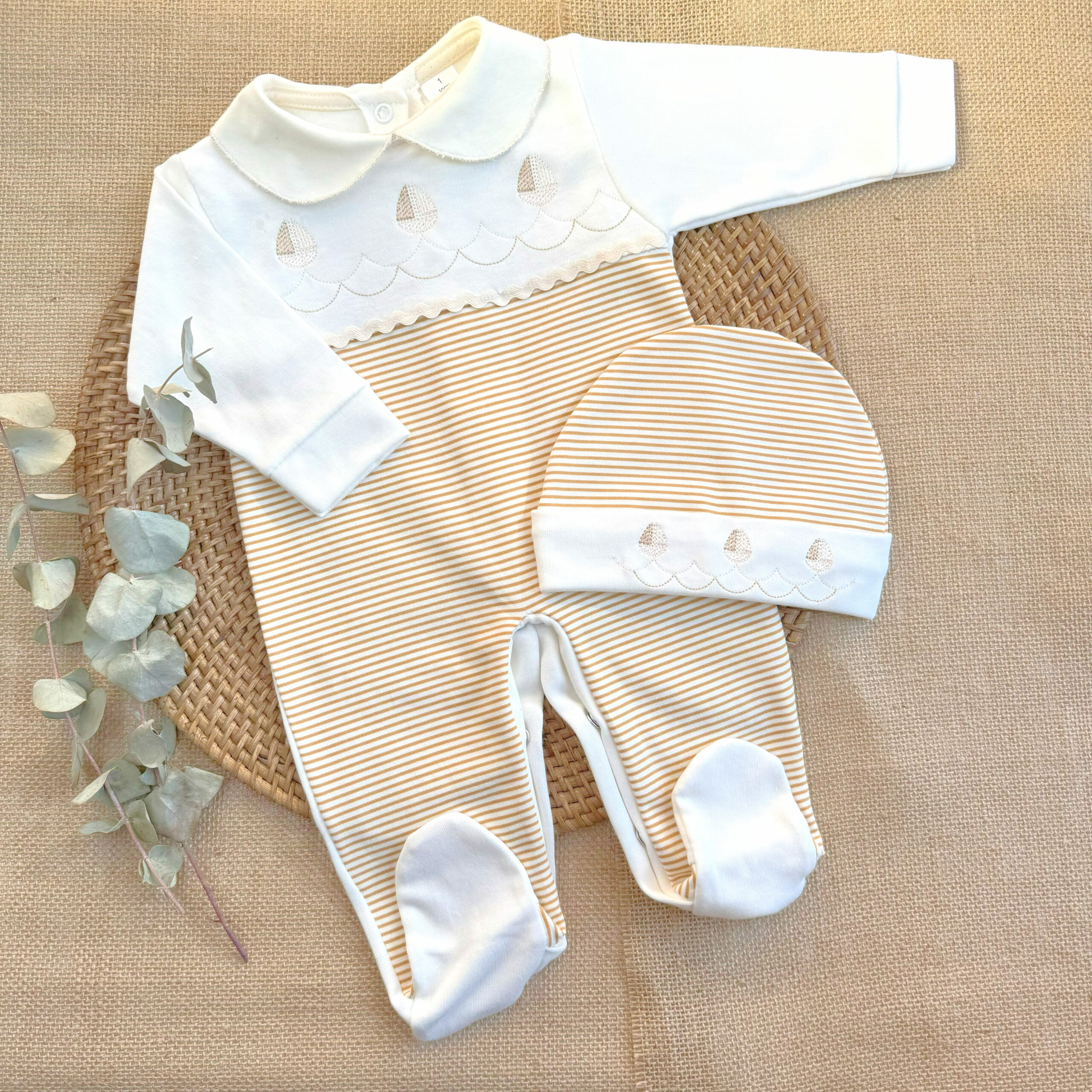 Precioso pijamita de algodón 100 % con gorrito a juego. Ideal para verano, para que los bebés estén cómodos y bellos en cualquier situación. Se abrocha por la espalda y por la entrepierna con corchetes para facilitar el cambio de pañal.