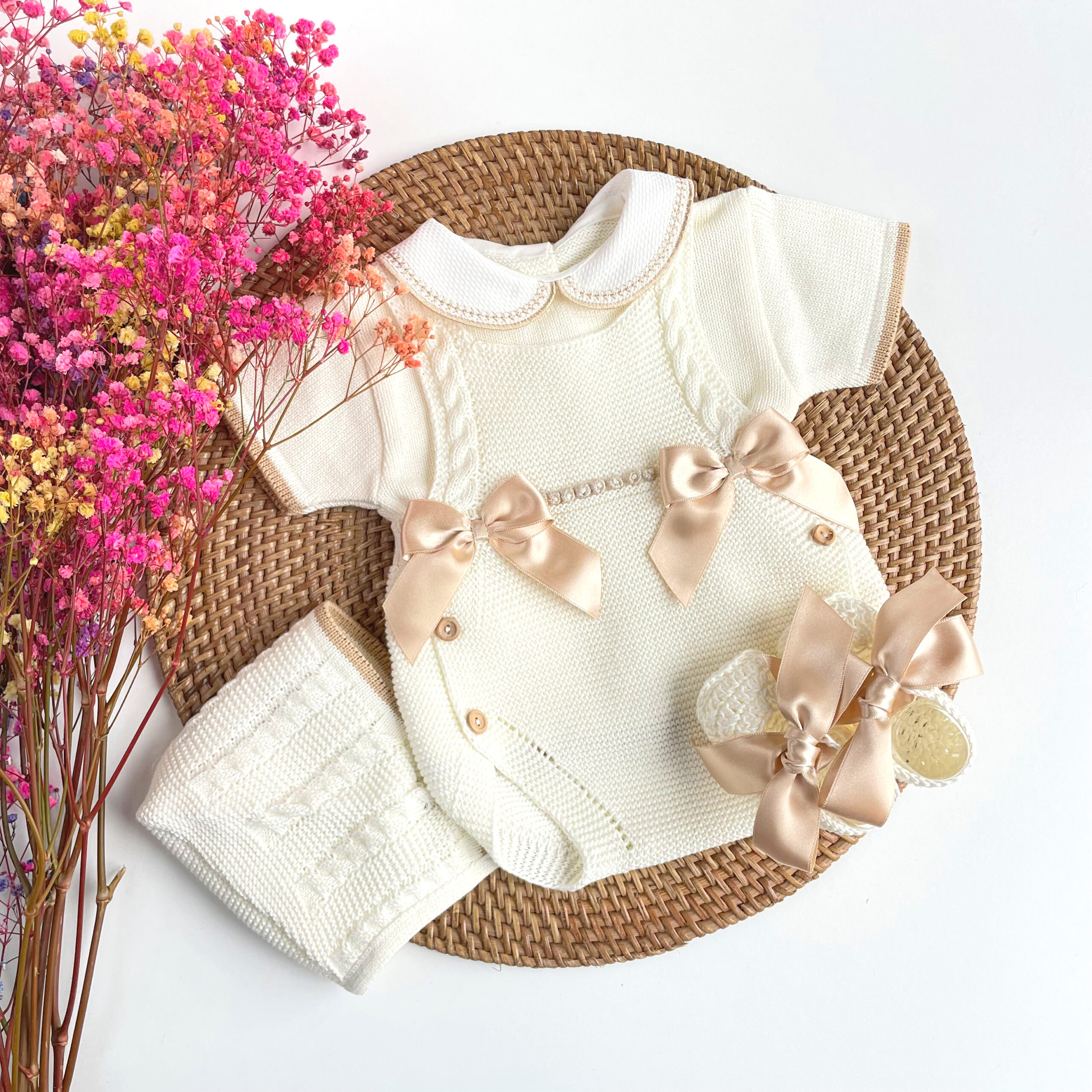 Preciosa ranita de primera puesta con jersey, capota y patucos a juego, elaborada en algodón 100 %.