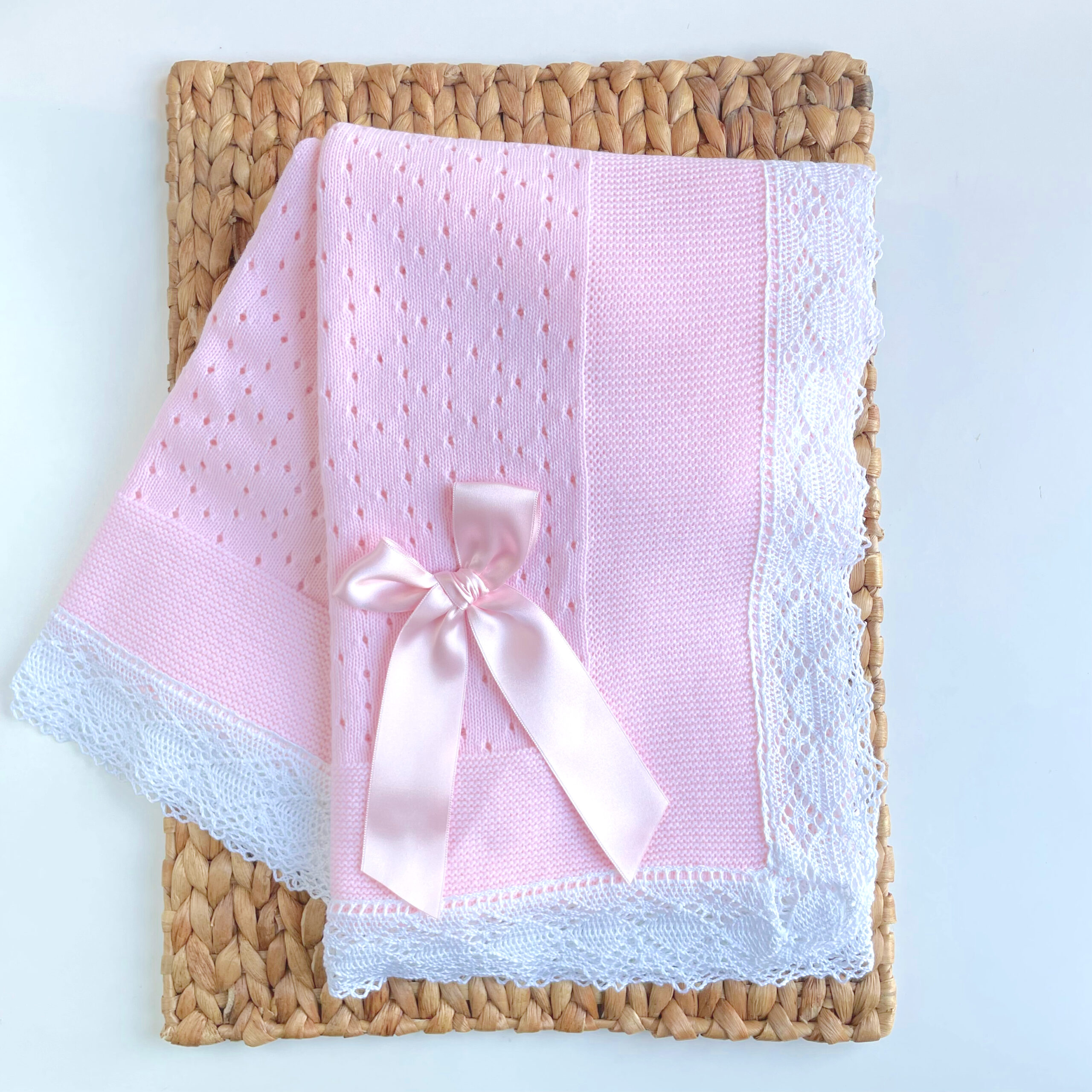 Toquilla con detalle de lazo y puntilla alrededor, elaborada en dralón 100 %.