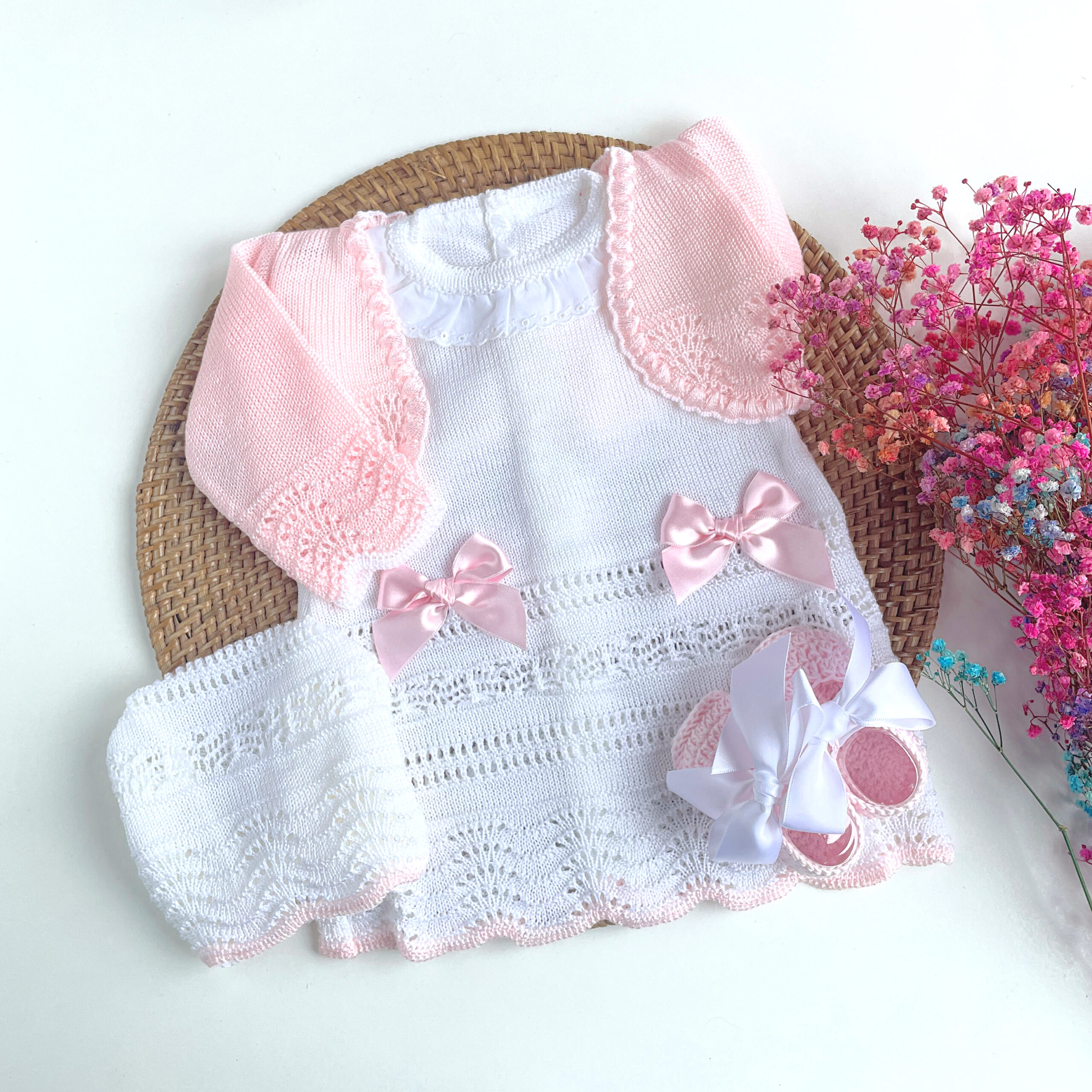 Precioso vestido de hilo perlé con chaqueta y patucos a juego. Ideal para primavera-verano.